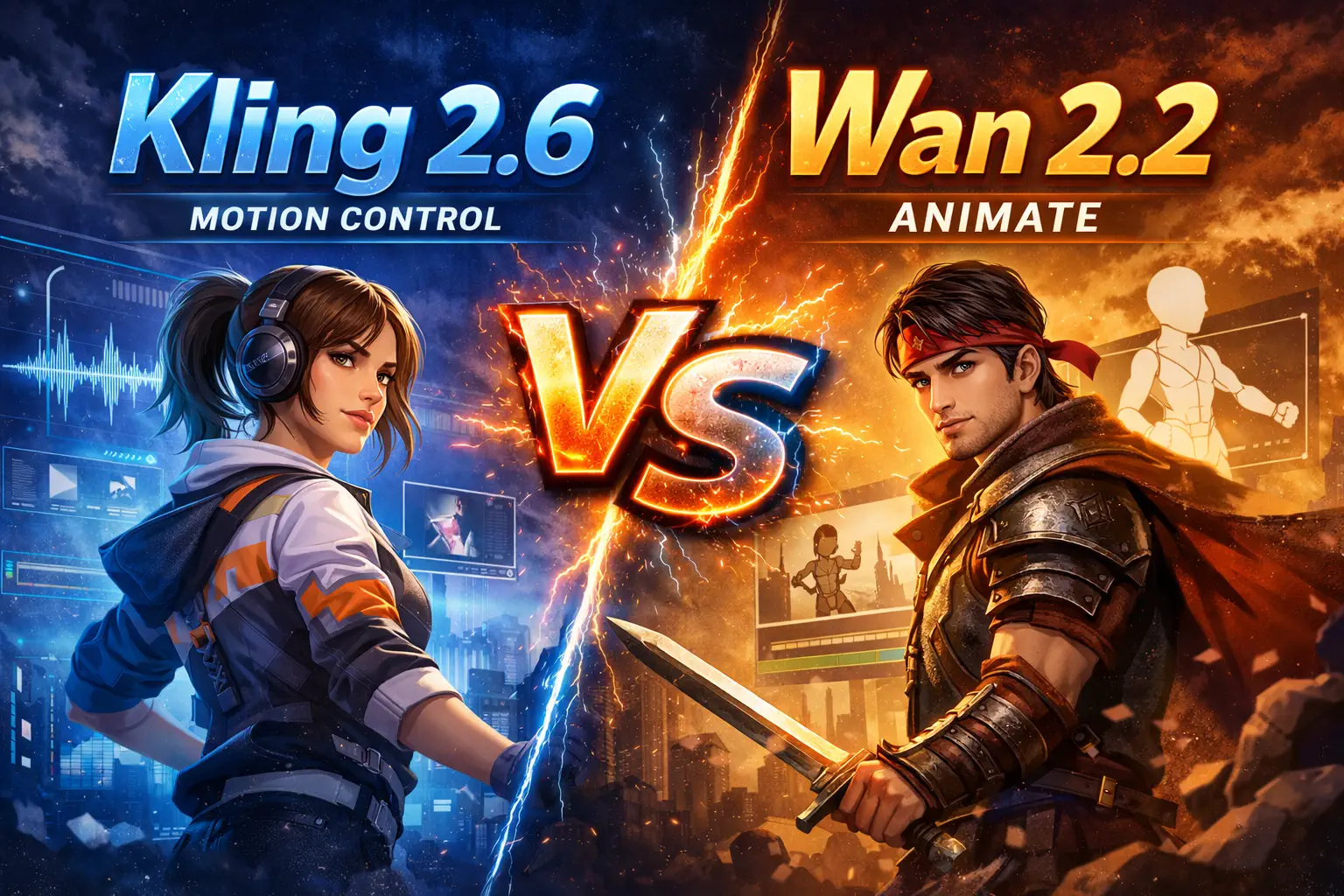 Comprehensive comparison between Kling 2.6 Motion Control and Wan 2.2 Animate for AI-driven motion generation. Discover key differences in motion transfer, character animation, audio sync, and which tool fits your creative workflow.